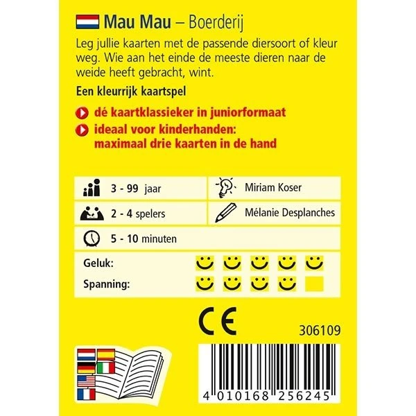 Kaartspel Mau Mau Junior is dé kaartklassieker in juniorformaat met eenvoudige regels en ideaal voor kinderhanden: maximaal drie kaarten in de hand. Wat een prachtige dag! Natuurlijk willen vandaag alle boerderijdieren in de bloemenweide spelen. De spelers kunnen ze er alleen naartoe brengen met het wegleggen van kaarten met de passende diersoort of kleur. Wie aan het einde de meeste dieren naar de weide heeft kunnen brengen, wint.