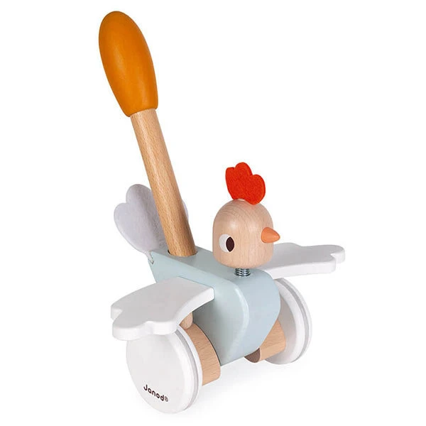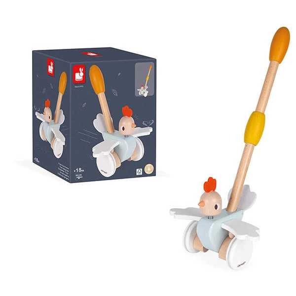 Duwstok kip is super leuk speelgoed voor de allerkleinsten. Dit prachtige houten duwspeelgoed is ideaal om uw kind te helpen leren lopen. Zodra de kip in beweging komt gaat ze fladderen met haar vleugels en beweegt haar hoofd zachtjes op en neer. Deze duwstok heeft een afneembare en verstelbare handgreep, aanpasbaar aan de grootte van je kind. De kam en staart van de kip zijn gemaakt van vilt voor een zeer zachte aanraking!