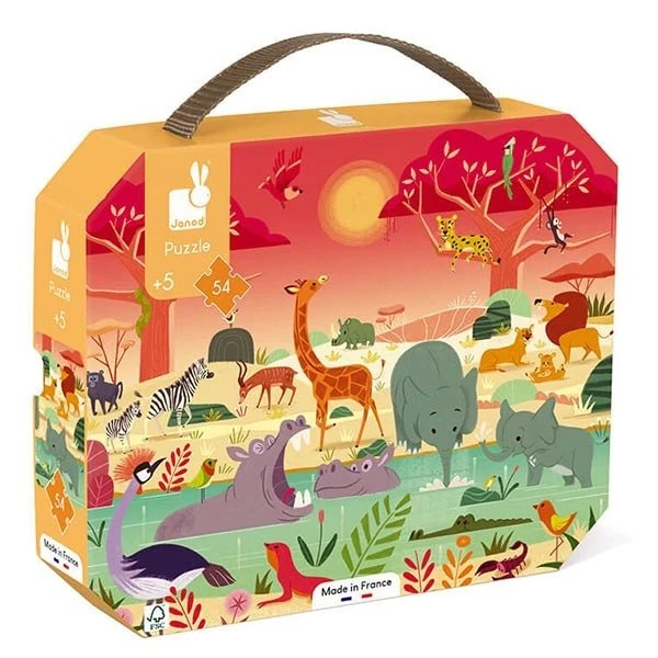 Met puzzel dierenreseraat gaat je kind op safari terwijl het zijn geheugen en behendigheid ontwikkelt. In zijn mooie koffer is deze puzzel gemakkelijk te vervoeren dankzij het stoffen handvat. Bevat een poster die als sjabloon dient. Aantal puzzelstukken: 54.