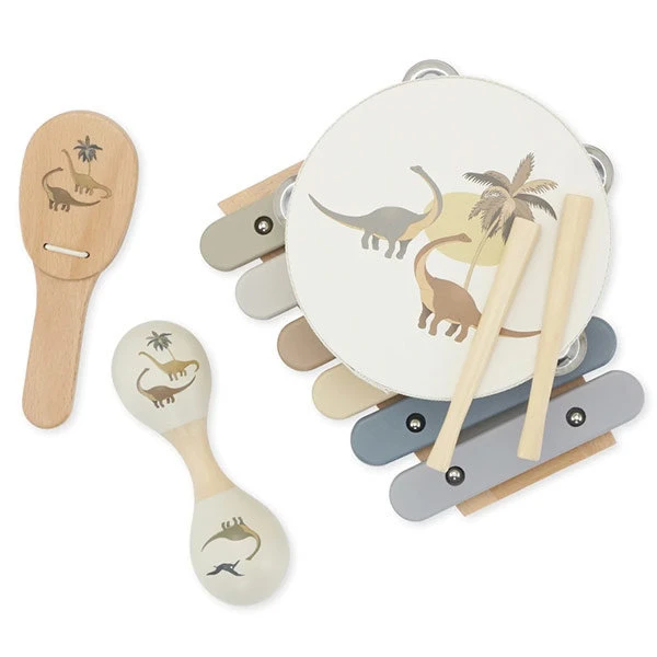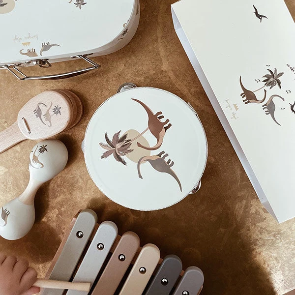 Prachtige muziekset in Dino design voor je kind. Verpakt in een mooi kartonnen koffertje afgewerkt met een metalen sluiting en handgreep. De muziekset bestaat uit 4 houten muziekinstrumenten: sambaballen, castagnetten, een tamboerijn en een xylofoon. Een geweldig cadeau voor muzikale kinderen.