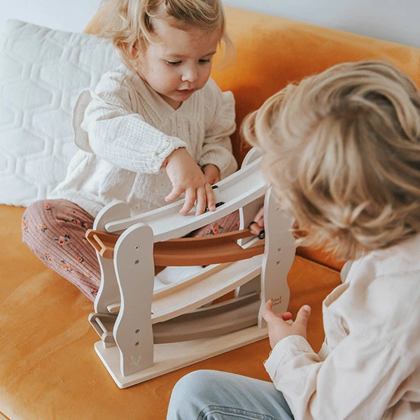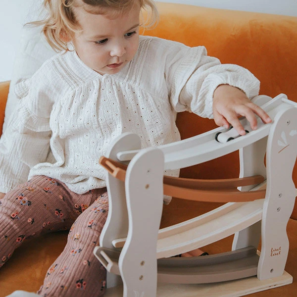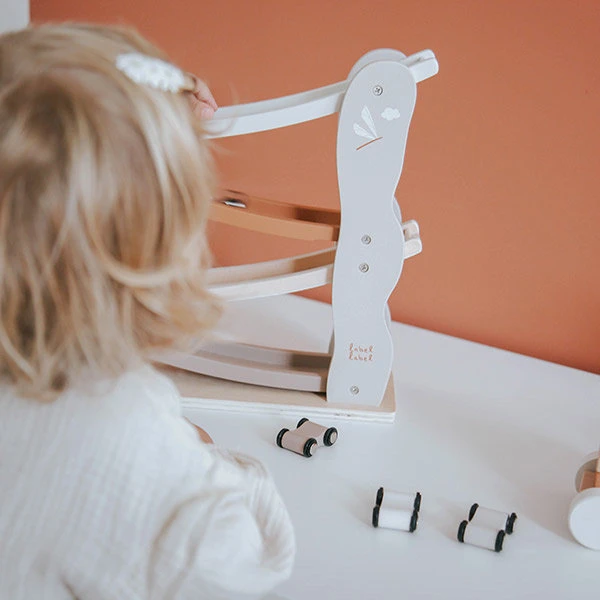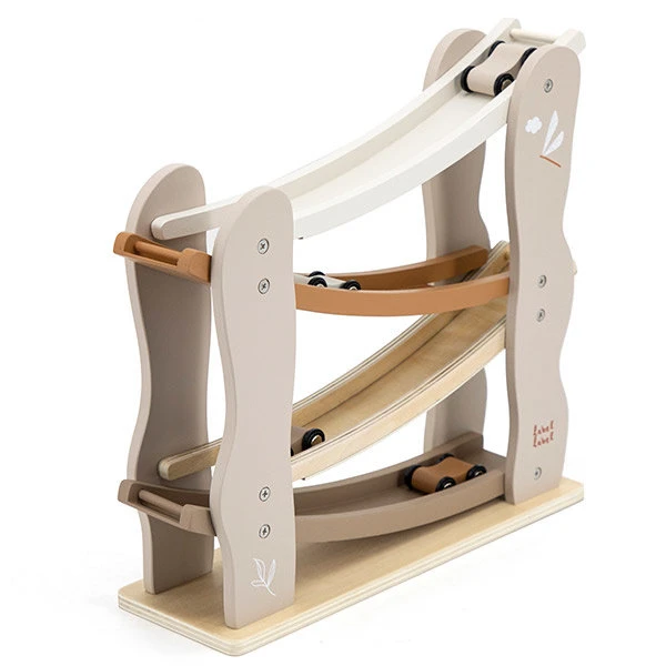 Deze autobaan in prachtige Nougat tinten zorgt voor non-stop activiteit en speelplezier bij kinderen. Plaats één van de vier autootjes bovenaan de autobaan en zie hem naar beneden scheuren en draaien! Absolute fun verzekerd! Kinderen houden van deze repetitieve activiteit die hun motorische vaardigheden, coördinatie en logisch redeneringsvermogen op een plezierige wijze stimuleren.