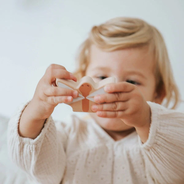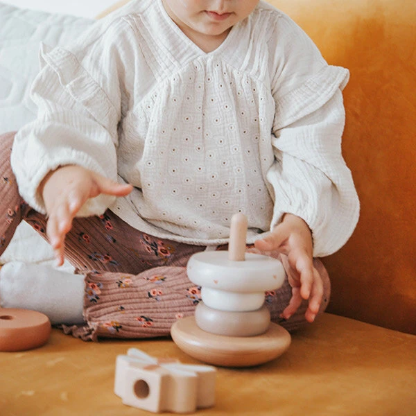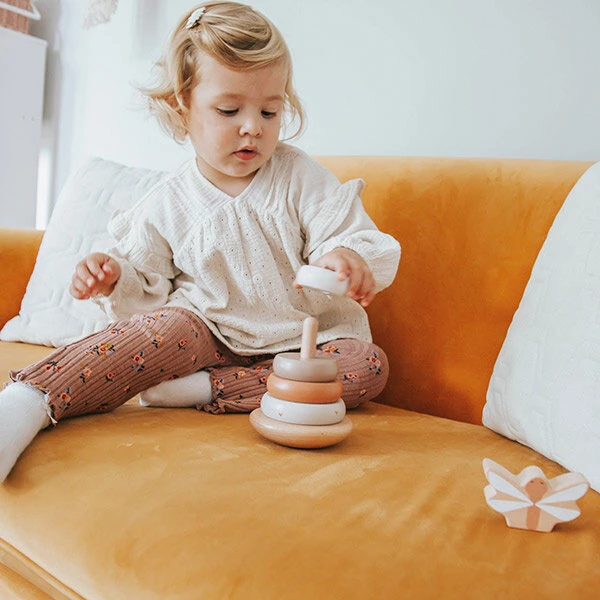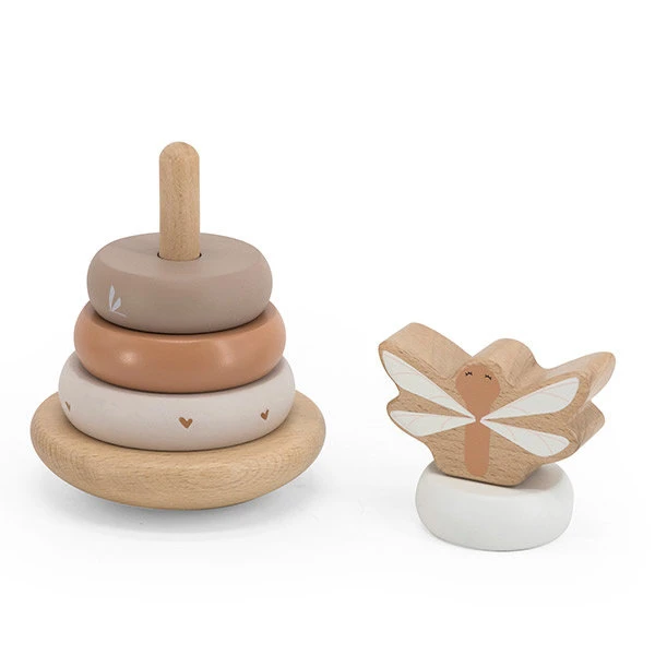 Bouw een stapeltoren in prachtige Nougat tinten door de ringen van groot naar klein te stapelen en werk de top af met de mooie blok met libelle. Een leuke uitdagen voor jonge kinderen daar de basis schommelt. Ideaal voor het oefenen van de hand-oog coördinatie en het redeneringsvorm bij kinderen.