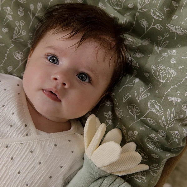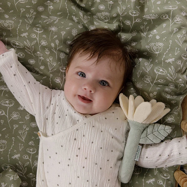 Deze mooie rammelaar in de vorm van een bloem is super leuk babyspeelgoed! Speel met de rammelaar en je hoort een plezierig geluidje. In de blaadjes van de bloem is een knisper verstopt voor extra plezier. De rammelaar stimuleert de hand-oogcoördinatie, is van heerlijk zacht materiaal gemaakt en kan makkelijk door kleine kinderhandjes vastgepakt worden.