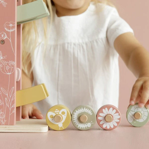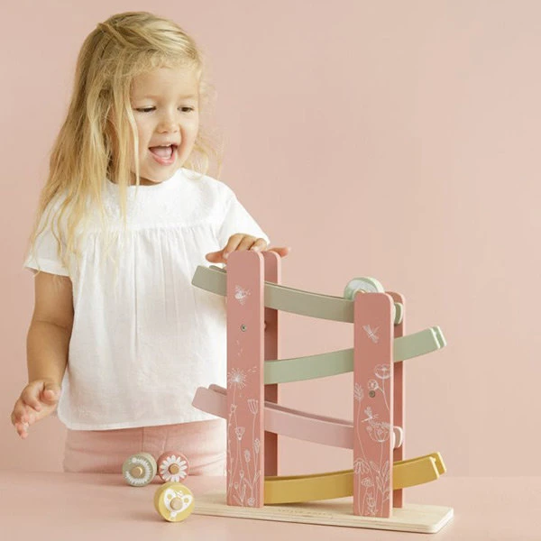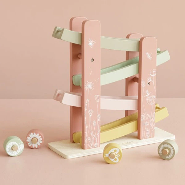 Met deze houten rollerbaan Wild Flowers beleven kinderen uren plezier. Zet de 4 versierde wielen: kever, rups, slak en bloem, één voor één boven op de knikkerbaan; laat ze los en ze racen naar beneden. 1, 2, 3, racen maar! Kindjes vinden dit geweldig! De kracht van deze rollerbaan zit dan ook in de herhaling van het spel.