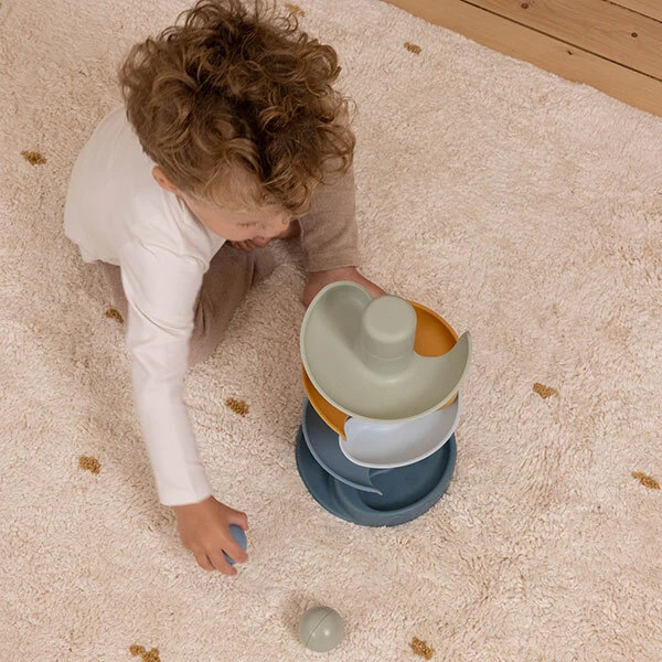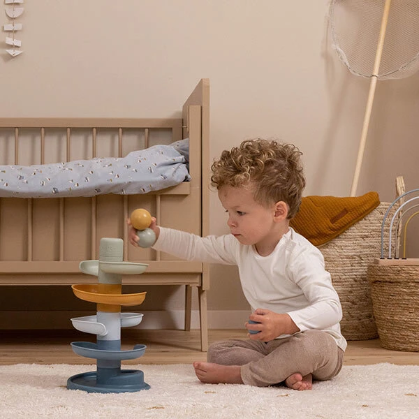Deze spiraaltoren in prachtige Blue tinten zorgt voor eindeloos veel speelplezier. De spiraaltoren bestaat uit vijf gekleurde delen die je kindje gemakkelijk op elkaar stapelt en drie ballen die je vrolijk van boven naar beneden kan laten rollen. Dit babyspeelgoed draagt bij aan de ontwikkeling van de hand-oog coördinatie en leertje je kindje over oorzaak en gevolg, waarmee het zowel leuk als leerzam spelen is. De drie lichte en makkelijk vast te pakken ballen maken een geluidje bij beweging.