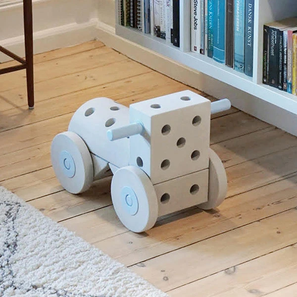 - Inhoud: 35 onderdelen: 7 blokken, 18 staven, 8 wieltjes, 1 zakje voor de staafjes en een boekje met inspiratie om te beginnen bouwen