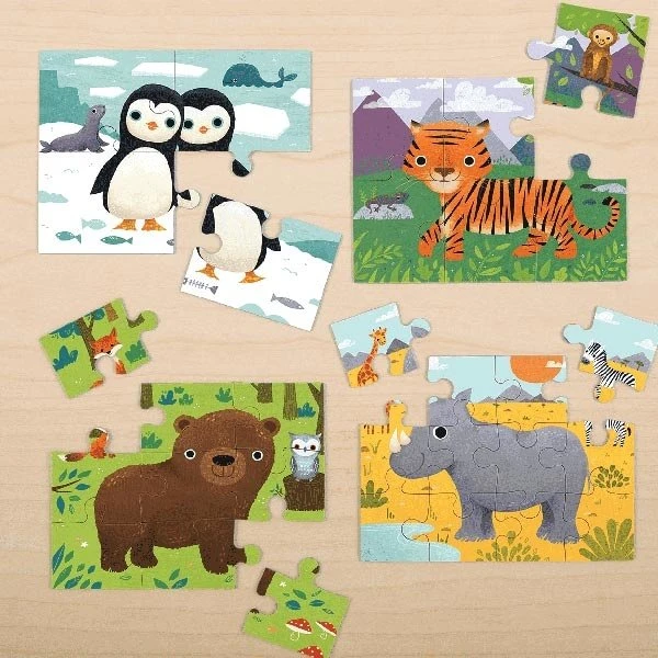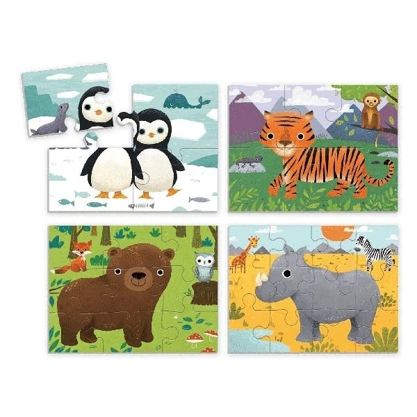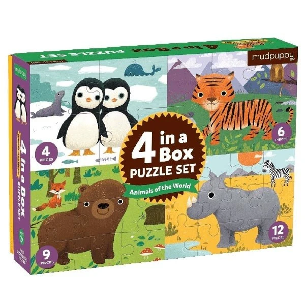 4 in a box is een leuke puzzleset van 4 puzzels met Dieren van de wereld. Elke puzzel heeft een ander moelijkheidsniveau. Puzzels van elk 4, 6, 9 en 12 stukjes onthullen prachtige dieren van de wereld! Puzzelen stimuleert de fantasie en de cognitieve ontwikkeling.