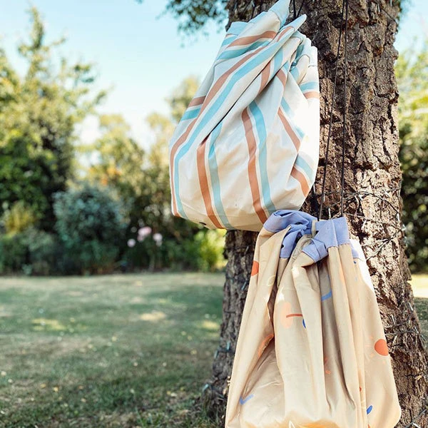 Deze outdoor opbergzak en speelmat in 1, met leuke Stripes print is de unieke, waterdichte oplossing om al je spullen gemakkelijk mee te nemen voor een dagje strand, park of picknick. Leg de opbergzak open en tover hem om tot een leuke speelmat om op te zitten of te spelen. Is de grond nat, dan blijf jij zeker droog. Tijd om te gaan? Trek aan het touw en alls is netjes opgeborgen in een praktische opbergzak. De verstelbare schouderriem maakt het makkelijk om de opbergzak te dragen. De speelmat heeft een diameter van wel 140 cm en is gemaakt van hoogwaardig zacht PU-gelamineerde polykatoen.