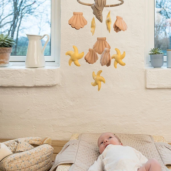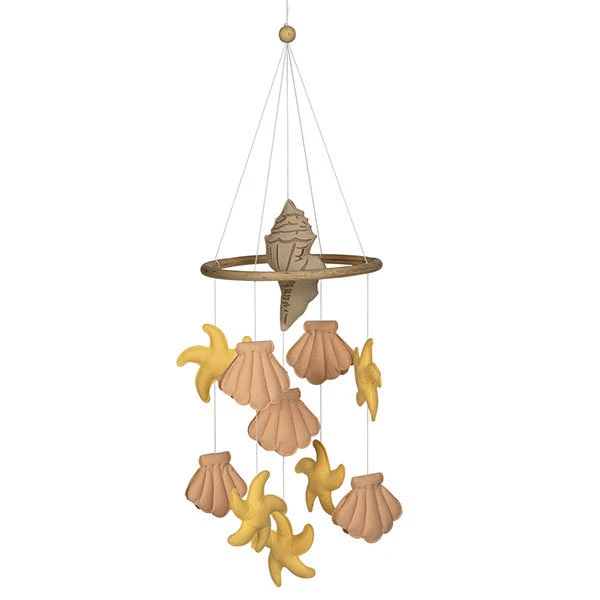 Deze Shell mobiel is een prachtige decoratie voor de babykamer. De schelpen en zeesterren aan deze mobiel zijn gemaakt van 100% biologisch katoen bevestigd aan een houten ring met een doorsnede van 21.5 cm. De mobiel hang je eenvoudig omhoog met de voorziene ring.