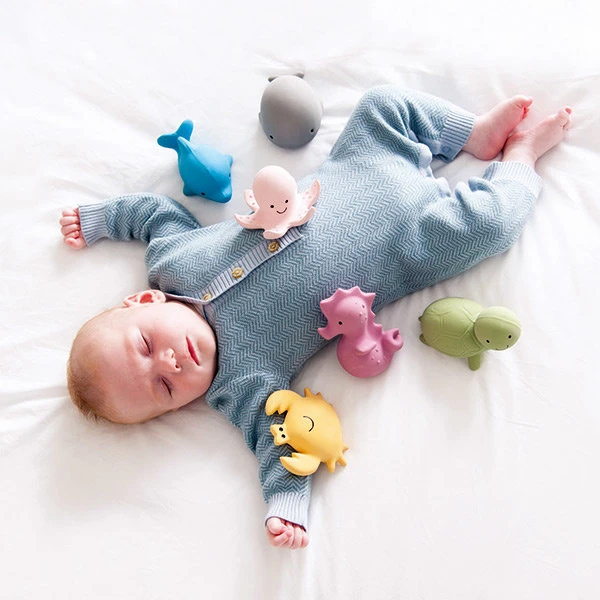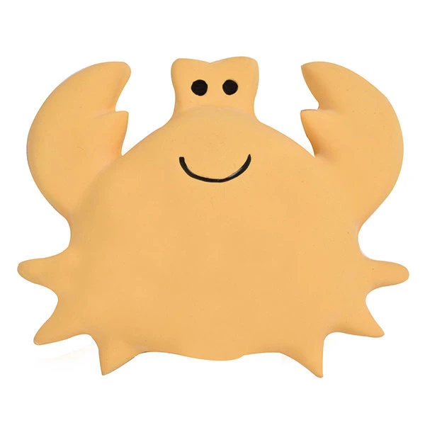 Dit badspeeltje, een schattige krab met belletje in natuurlijk latex is ideaal om mee te spelen en in te bijten. Het badspeelgoed heeft geen gaatje, waardoor bacteriën en schimmels geen kans hebben zich te nestelen. Het speeltje ziet er leuk uit, is zacht en flexibel en past perfect in kleine handjes.