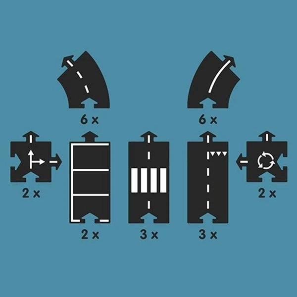 - Inhoud: 8 bochten, 6 rechte baandelen, 1 kruising en 1 rotonde